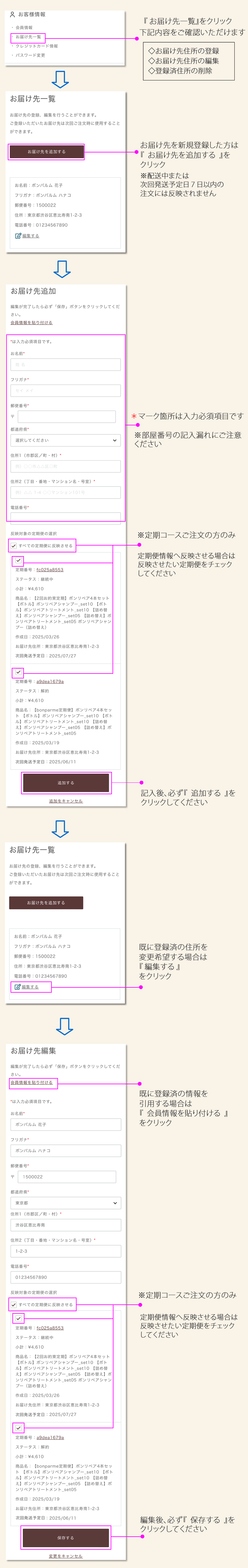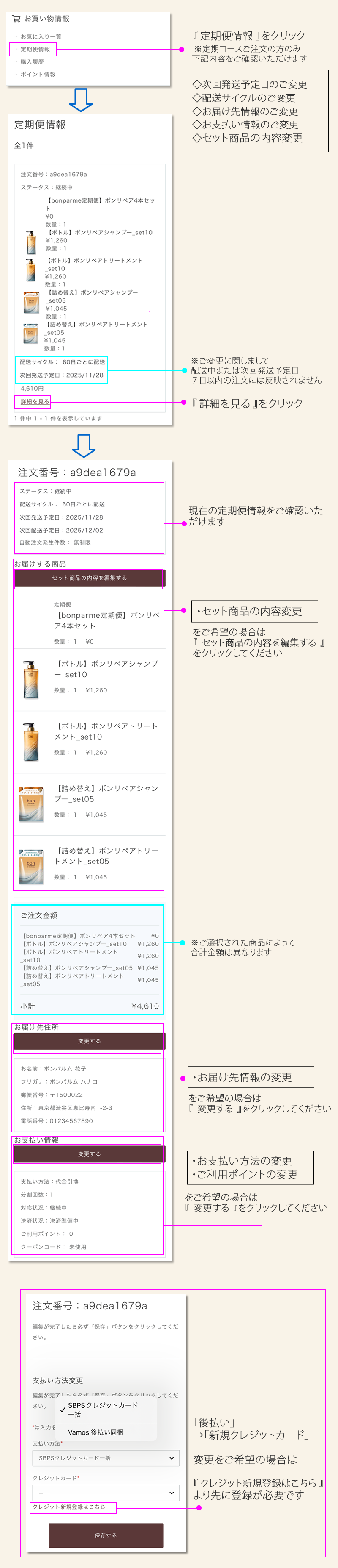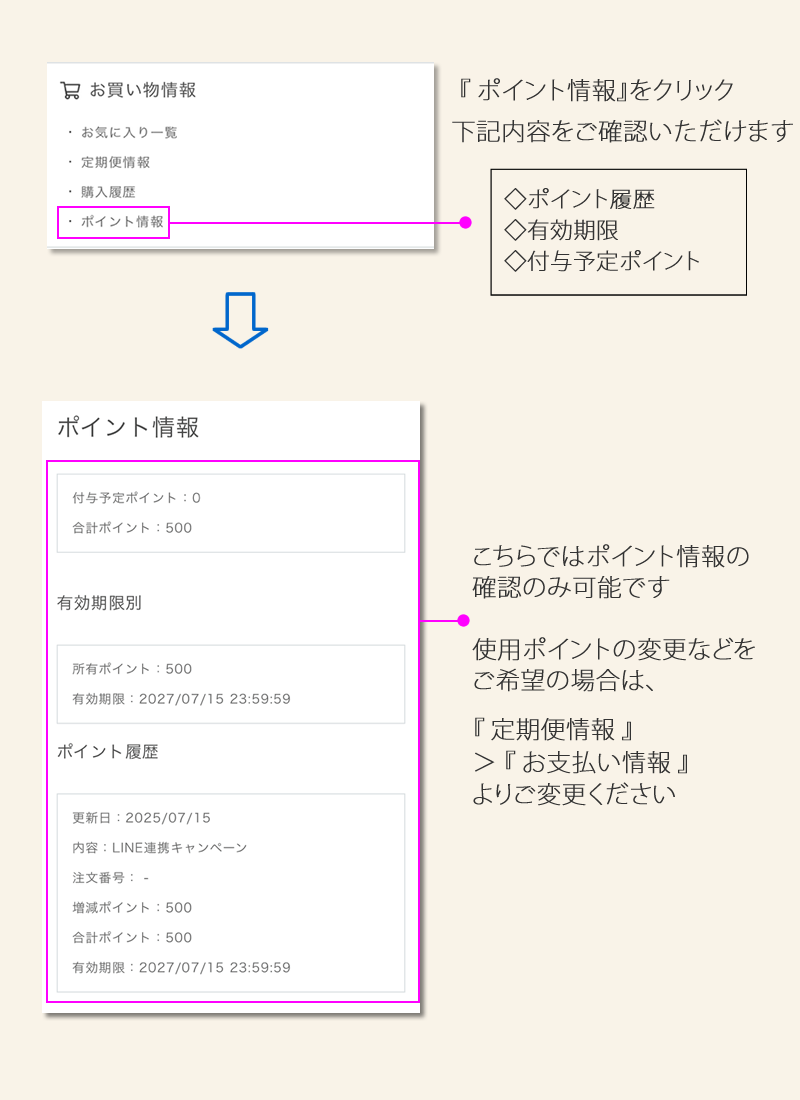 1. お気に入り一覧 ▶ 2. 定期便情報 ▶ 3. 購入履歴 ▶ 4. ポイント情報 ▶ 5. 会員情報 ▶ 6. お届け先一覧 ▶ 7. クレジットカード情報 ▶