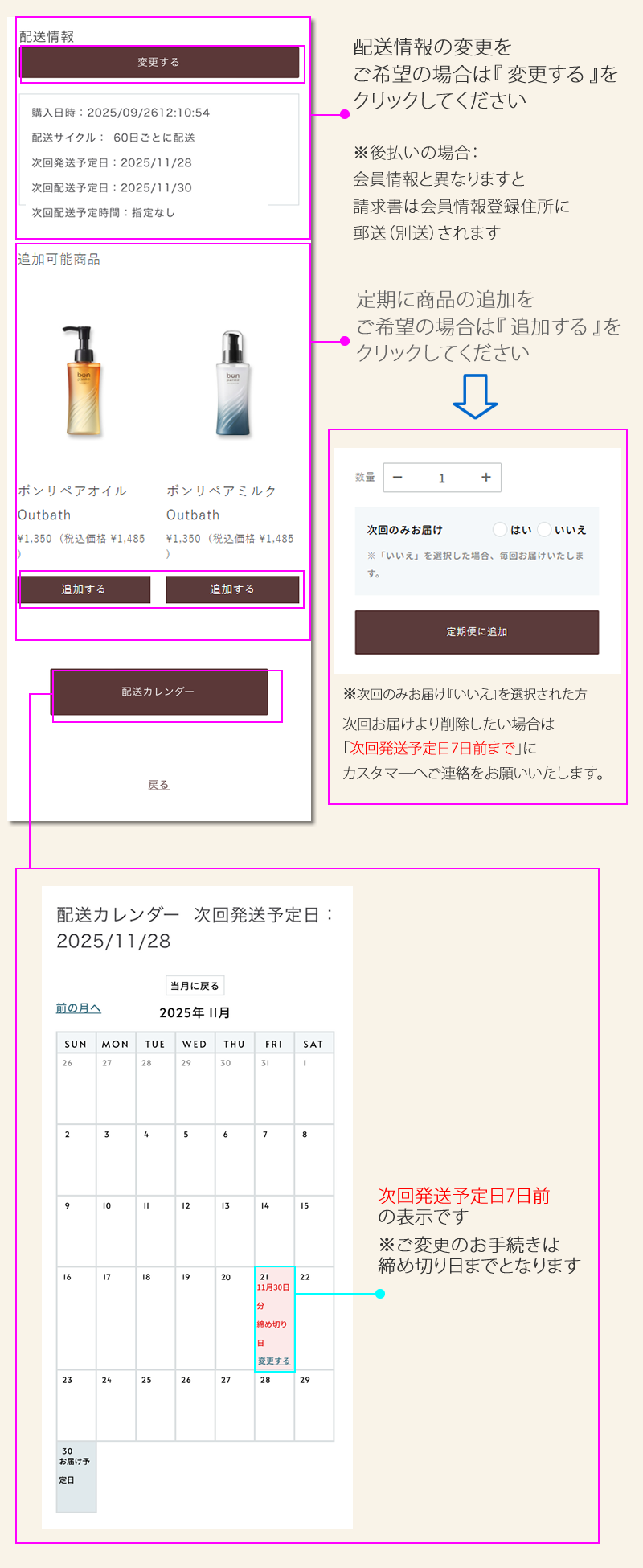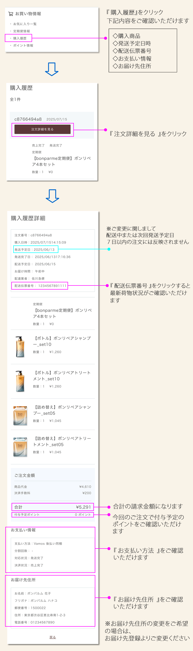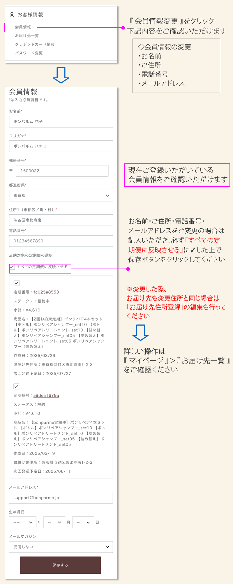 1. お気に入り一覧 ▶ 2. 定期便情報 ▶ 3. 購入履歴 ▶ 4. ポイント情報 ▶ 5. 会員情報 ▶ 6. お届け先一覧 ▶ 7. クレジットカード情報 ▶